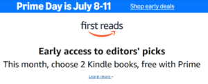 Amazon is offering lots of great deals for Prime month, including doubling the number of free First Reads books. Prime members can click head over here to score TWO free early-access Kindle books this month (in other months, you’ll get one).