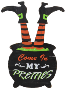 Come In My Pretties wood yard stake featuring a cauldron with the witch’s legs sticking out
