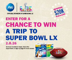 Head over here to enter to win an amazing trip to the Super Bowl worth over $20,000 from P&G. You’ll also get access to P&G Brandsaver Perks that will give you over $100 in coupons on their products!
