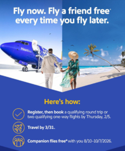 Register for this promotion, then book one qualifying round trip or two qualifying one-way Southwest® flights between 8:00 a.m. Central Time (“CT”) on February 2, 2026 and 11:59 p.m. CT on February 5, 2026 (the “Promotion Period”) for travel between February 2 and March 31, 2026 (the “Travel Period”), and fly during the Travel Period to earn a promotional Companion Pass® valid for use between August 10, 2026 and October 7, 2026.