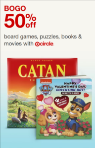 Head over here to get half off one book, movie, puzzle, or game when you buy one at Target this week! This is a great chance to stock up the birthday gift closet if you have kids who go to lots of parties or just get a couple of Valentine’s gifts.